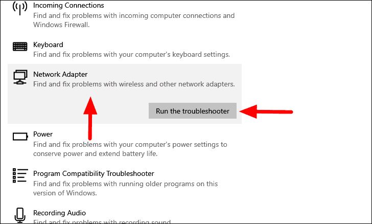 Windows 10 offers built-in troubleshooting options for several errors, including the ‘Network Adapters’. Running the troubleshooter has helped many users fix the ‘Ethernet doesn’t have a valid IP configuration’ error.