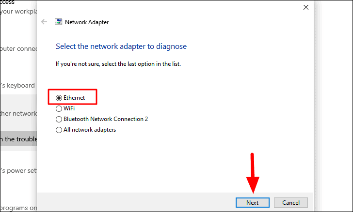 The troubleshooter window will now launch, and you will be asked to select the ‘Network Adapter’ before proceeding. Select the ‘Ethernet’ option, and then click on ‘Next’ at the bottom.