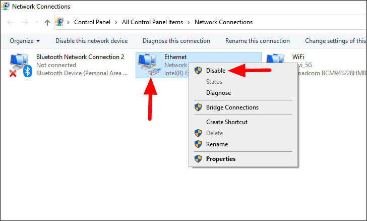 In the ‘Network Connections’ window, right-click on the ‘Ethernet’ option, and then select ‘Disable’ from the context menu.