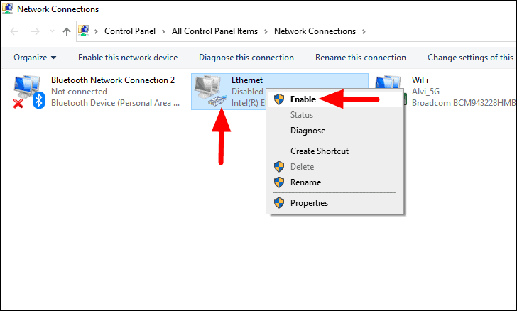 Again right-click on the ‘Ethernet’ option, and select ‘Enable’ from the context menu.