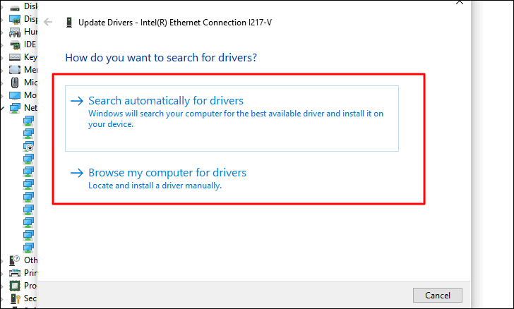 In the ‘Update Driver’ window, you will have two options, either to let Windows search for the best available driver and then install it on the system or manually select and install the driver that’s on your system. It’s recommended that you select the first option and let Windows search for it since the risk is far lower. Now follow the on-screen instructions to complete the installation process.
