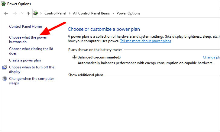 The ‘Power Options’ will now launch and the current power plan will be displayed. Click on the ‘Choose what the power button do’ near the top-left corner.