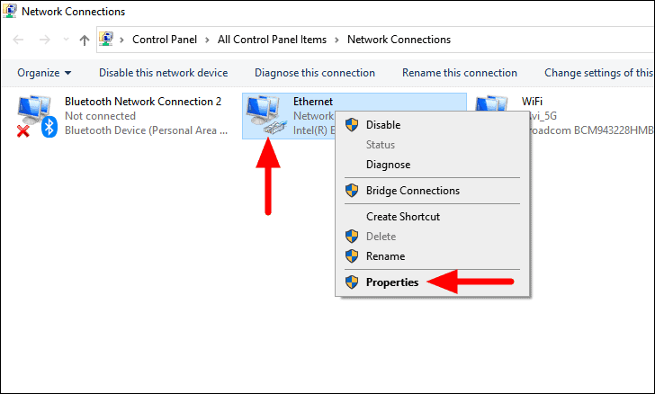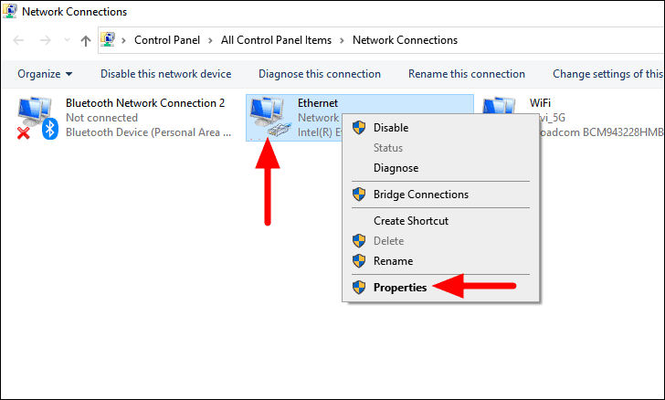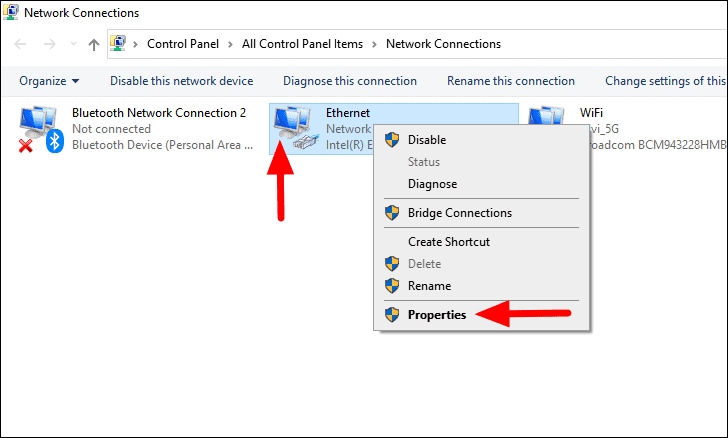 Next, right-click on the ‘Ethernet’ option, and then select ‘Properties’ from the context menu.