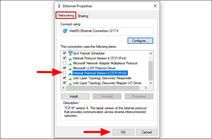 In the ‘Networking’ tab of ‘Ethernet Properties’, locate and uncheck the checkbox for ‘Internet Protocol Version 6 (TCP/IPv6)’, and then click on ‘OK’ at the bottom to save the changes.