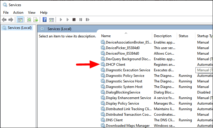 In the ‘Services’ window, locate the ‘DHCP Client’ option, and double-click on it.