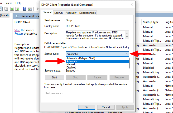 Next, click on the box next to ‘Startup type’ and select ‘Automatic’ from the drop-down menu.