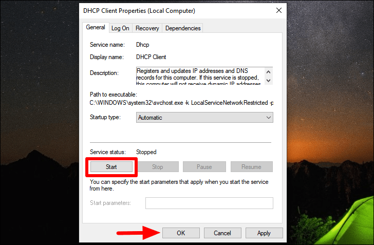 Next, click on ‘Start’ under the ‘Service Status’ section. After the service has been started, click on ‘OK’ at the bottom to apply the changes.
