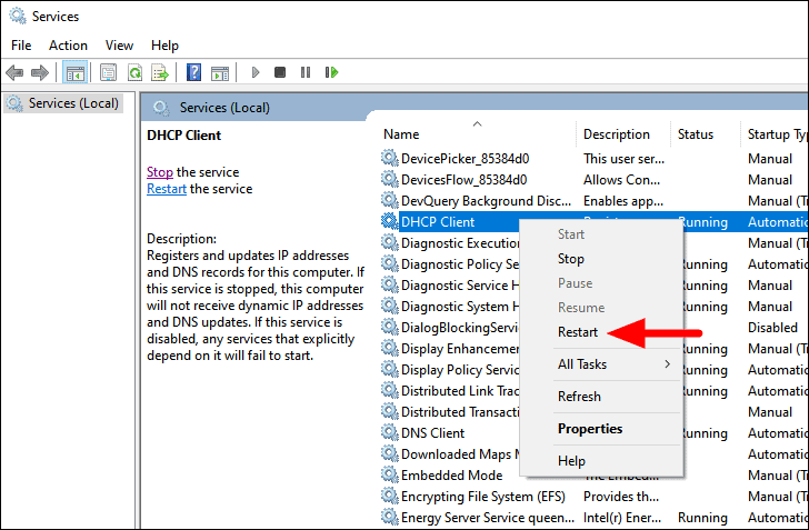Again, right-click on the ‘DHCP Client’ option in the ‘Services’ window, and select ‘Restart’ from the context menu.
