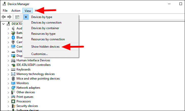 To disable Microsoft Kernel Debug Network Adapter, launch the ‘Device Manager’ via the ‘Start Menu’ or ‘Quick Access Menu’. In the ‘Device Manager’ window, click on the ‘View’ menu, and then select ‘Show hidden devices’ from the drop-down menu.