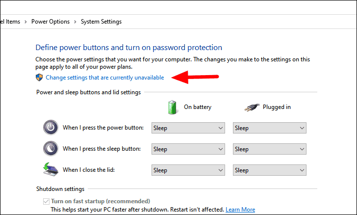 Next, click on the ‘Change settings that are currently unavailable’ option.