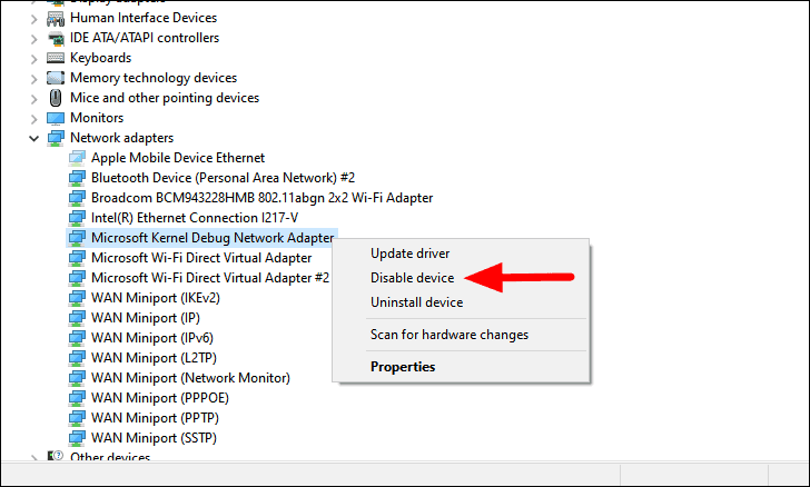 Now, right-click on the ‘Microsoft Kernel Debug Network Adapter’, and select the ‘Disable device’ option from the context menu.