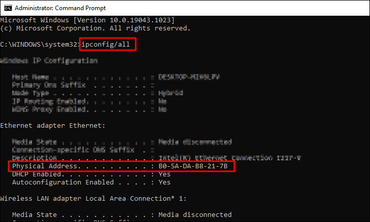 Now, note down the ‘Physical Address’ under the ‘Ethernet adapter’ section.