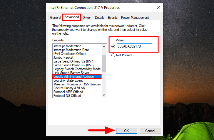 Next, navigate to the ‘Advanced’ tab, select ‘Locally Administered Address’ from the options under ‘Property’ and then enter the ‘Physical Address’ you noted down earlier in the box under ‘Value’. Finally, click on ‘OK’ to save the changes.