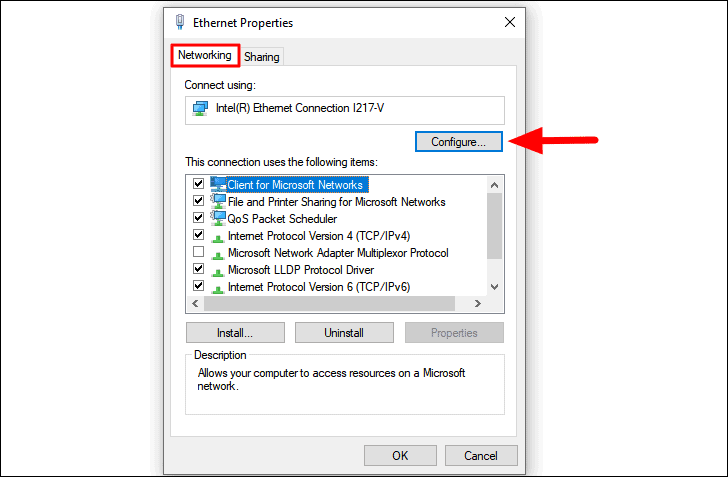 Next, click on ‘Configure’ in the ‘Networking’ tab of the ‘Ethernet Properties’ window.