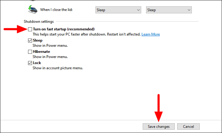 Now, untick the checkbox for ‘Turn on fast startup’ under ‘Shutdown settings’ and then click on ‘Save changes’ at the bottom.