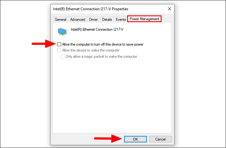 If the ‘Ethernet’ settings are set to conserve power, it might disable certain features, thus leading to the ‘Ethernet doesn’t have a valid IP configuration’ error. If you are encountering the error, it’s recommended that you disable these settings.