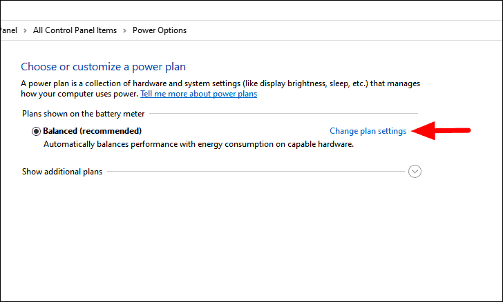 The current power plan will now be displayed on the screen. Click on the ‘Change plan settings’ option next to it.