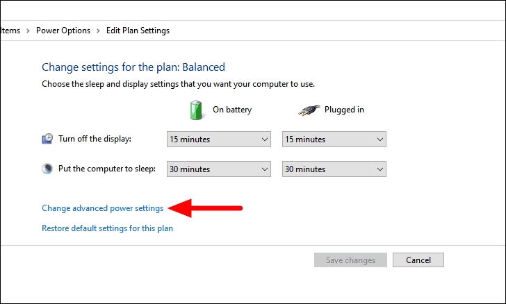 In the ‘Edit Plan Settings’ window, click on the ‘Change advanced power settings’ option.