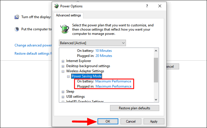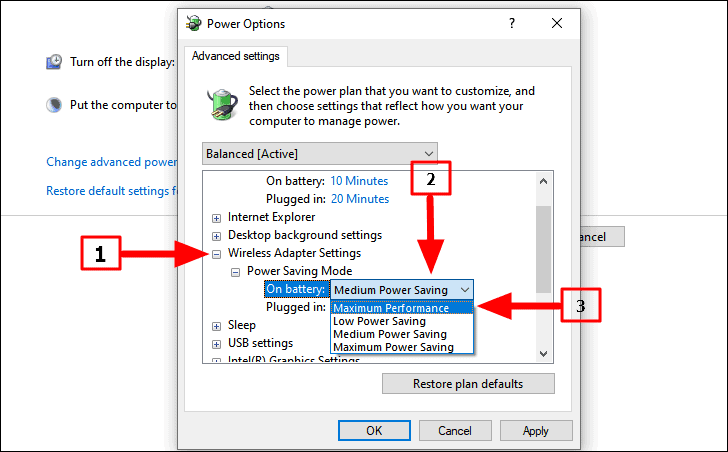 Next, click on ‘Wireless Adapter Settings’ to expand and view the options under it. Now, click on the box next to ‘On battery’, and select ‘Maximum Performance’ from the drop-down menu.