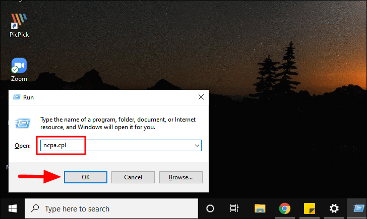 To manually assign the MAC address, launch the ‘Run’ command, enter ‘ncpa.cpl’ in the text box, and click on ‘OK’ at the bottom.