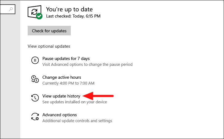 Next, click on the ‘Views update history’ option in the ‘Windows Update’ tab that opens by default.