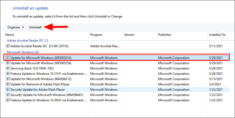 All the recent updates will now be listed on the screen along with the date of installation. Select the update and click on ‘Uninstall’ at the top. Now, follow the on-screen instructions to complete the process. You can similarly uninstall other recent updates, until you are on a stable version.