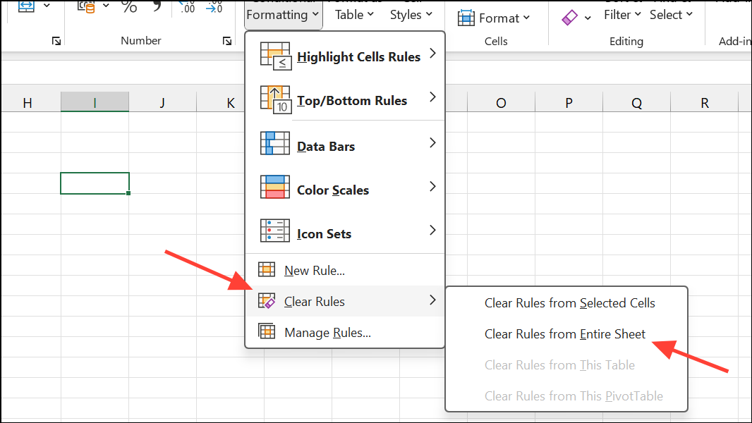 Step 2: Select “Clear Rules” and choose “Clear Rules from Entire Sheet.” This will remove all conditional formatting rules, which can significantly reduce the worksheet’s complexity and free up space for new cells.