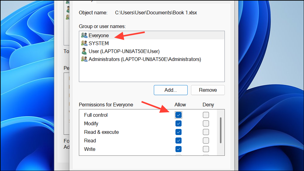 Step 2: Click Add, then Advanced, and select Find Now. From the list, choose Everyone and click OK. Back in the permissions window, select Everyone and check all boxes under Allow to grant full access. Click Apply and then OK.
