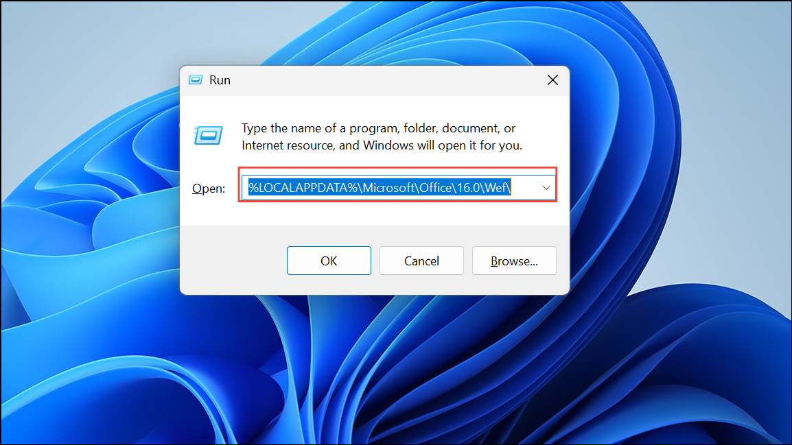 Step 2: Type %LOCALAPPDATA%\Microsoft\Office\16.0\Wef\ and press Enter to open Excel's cache folder.