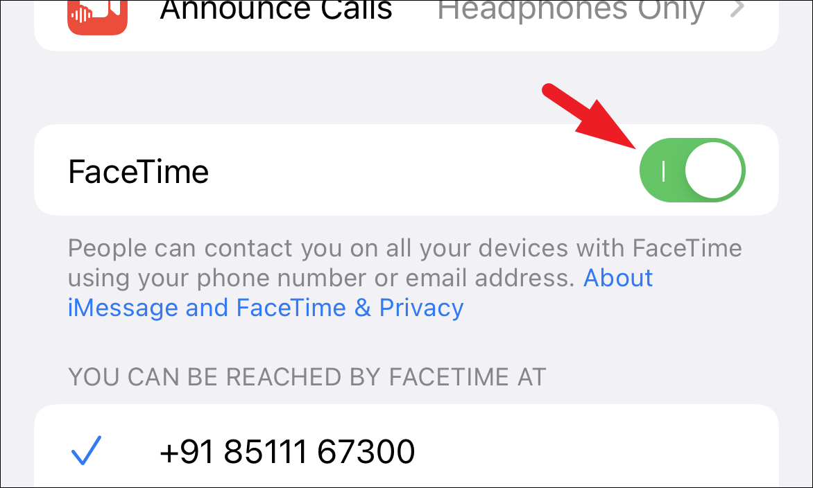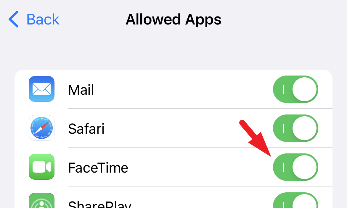 After that, first, locate the ‘FaceTime’ option from the list and then tap on the following toggle switch to bring it to the ‘On’ position, if not already enabled.