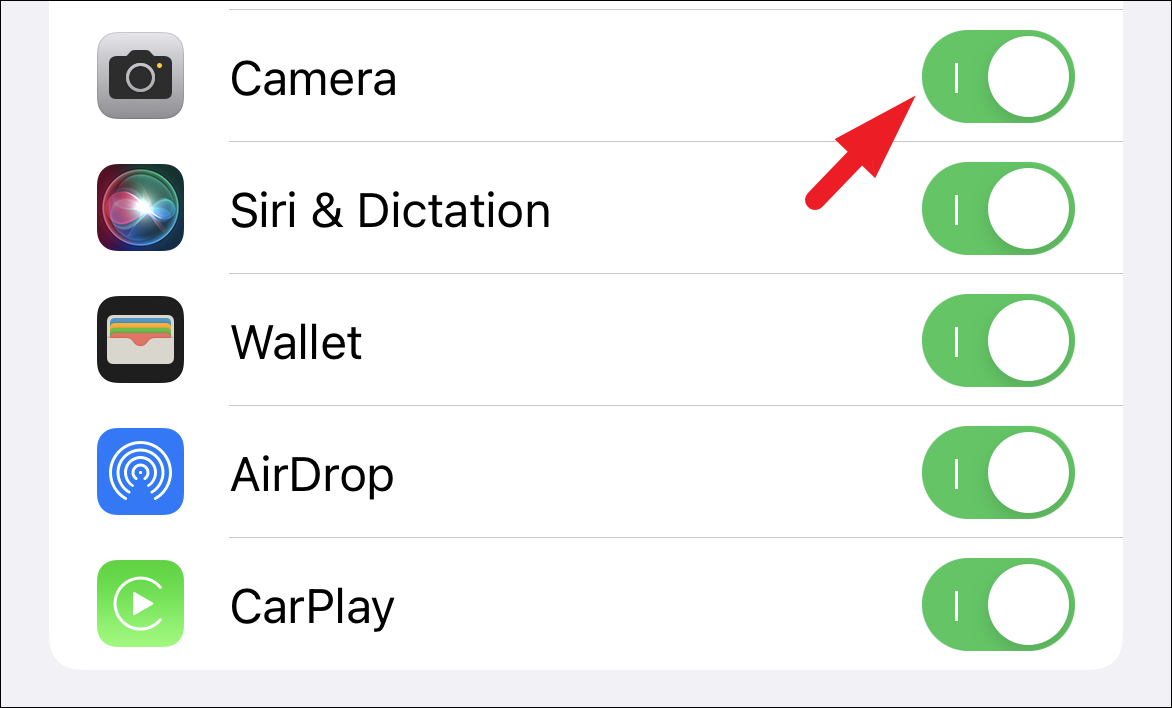Next, locate the ‘Camera’ option in the list, and similar to the previous step, tap on the following toggle switch to bring it to the ‘On’ position in order to provide it access.