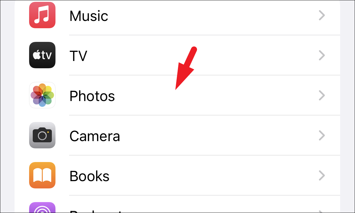 Next, on the ‘Settings’ screen, scroll down to locate and tap on the ‘Photos’ tile to proceed.