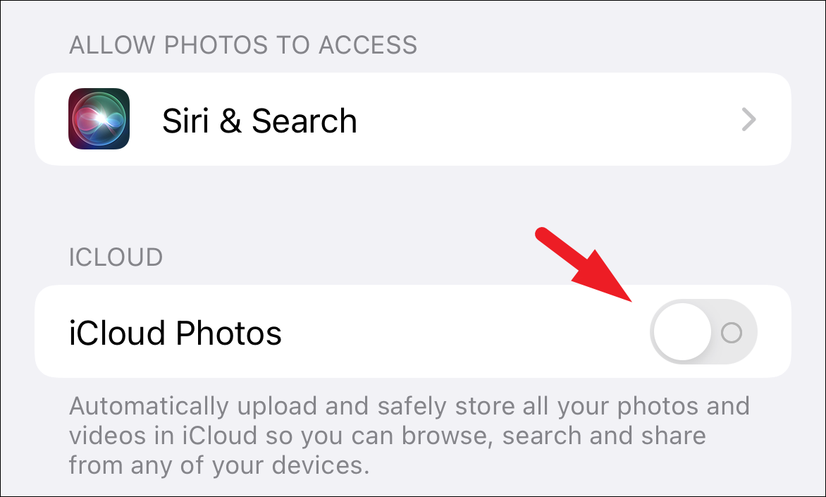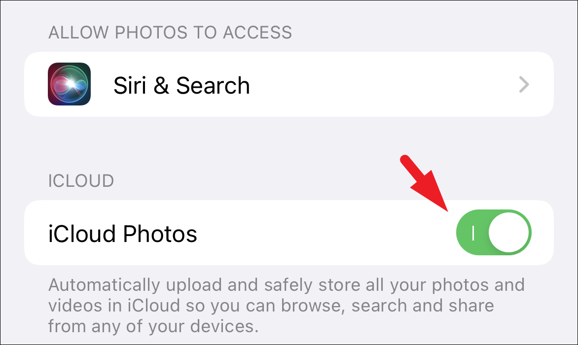 After that, on the ‘Photos’ settings screen, tap on the toggle switch present on the far right edge of the ‘iCloud Photos’ tile to bring it to the ‘Off’ position, situated under the ‘iCloud’ section.