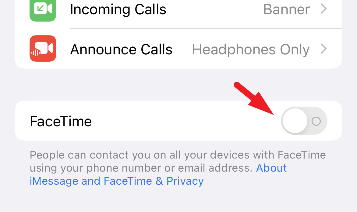 After that, locate the ‘FaceTime’ tile, and tap on the toggle switch present on the far right edge of the tile to bring it to the ‘Off’ position.