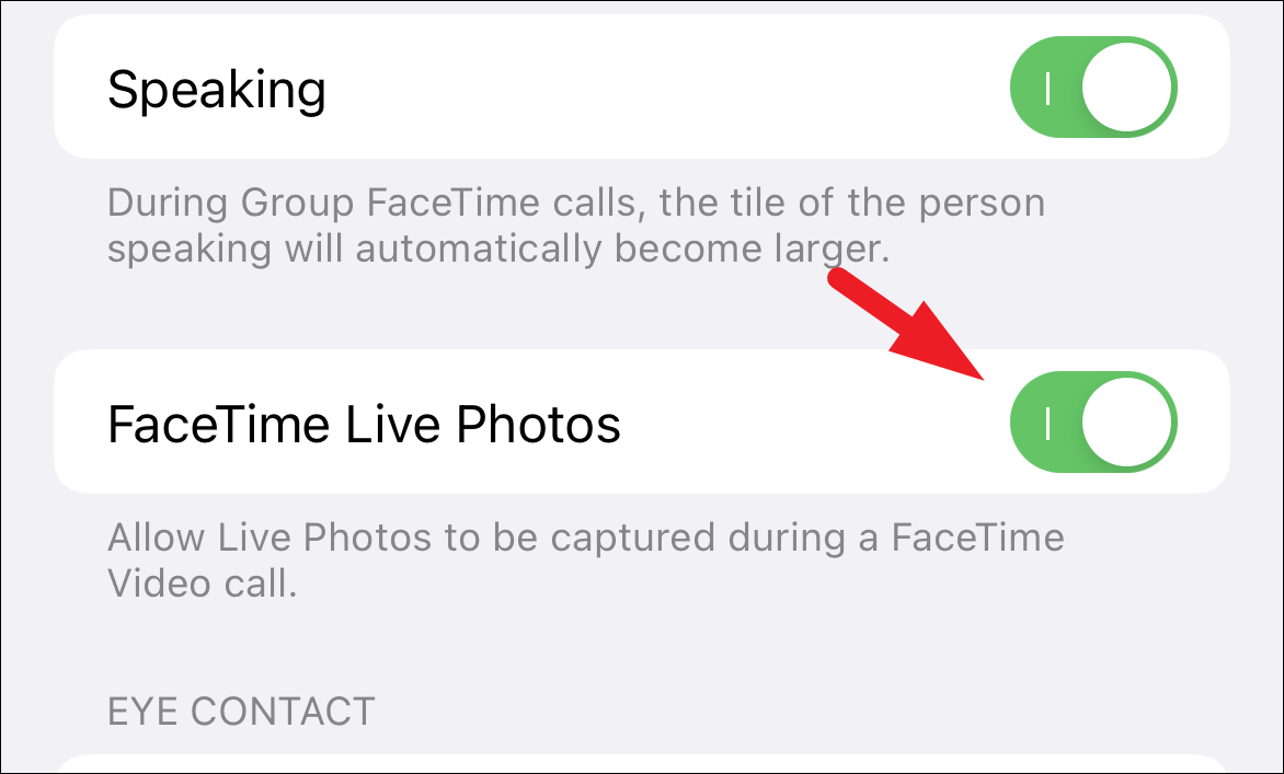 Then, on the ‘FaceTime’ settings screen, locate the ‘FaceTime Live Photos’ option and tap on the toggle switch present on the far right edge of the tile to bring it to the ‘On’ position, if not already enabled.
