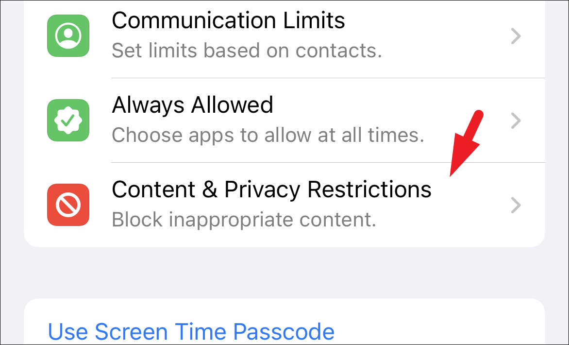 After that, on the ‘Screen Time’ settings screen, locate and tap on the ‘Content & Privacy’ Restrictions tab to proceed.