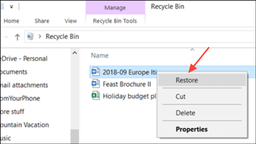 Step 2: Browse or search for the missing files in the Recycle Bin. If you locate them, select the files and choose Restore at the top of the page. This action returns them to their original location in your OneDrive.