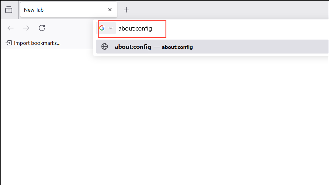 Step 1: Type about:config in the Firefox address bar and press Enter. If prompted with a warning, accept the risk to proceed.