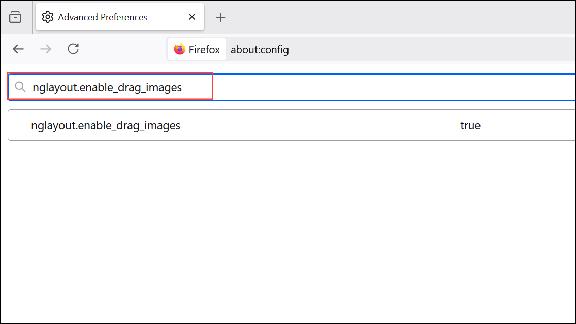 Step 2: In the search bar at the top of the configuration page, enter nglayout.enable_drag_images.