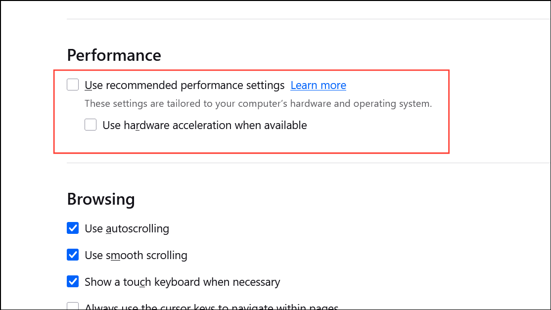 Step 3: Uncheck Use recommended performance settings to reveal additional options. Then, uncheck Use hardware acceleration when available.