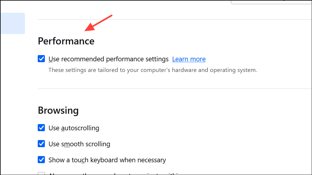 Step 2: Scroll down to the Performance section under the General tab.