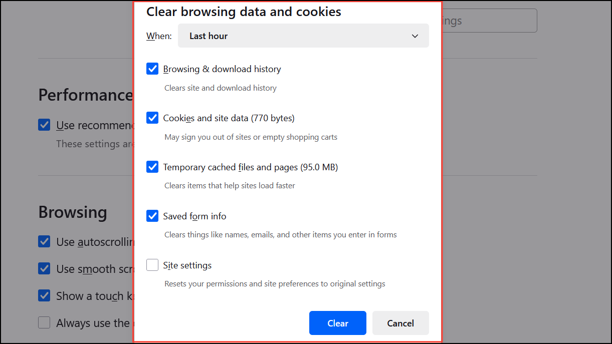 Accumulated browsing data, cookies, and cached files can slow down Firefox and contribute to freezing, especially during heavy tab usage.