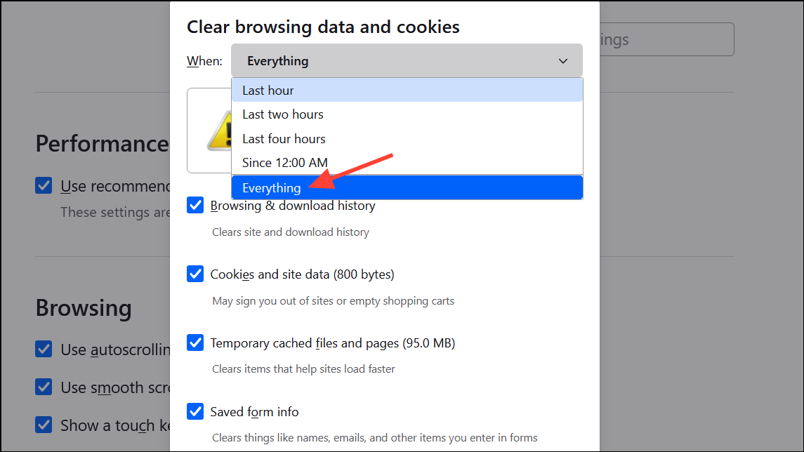 Step 2: Select Everything from the time range dropdown to clear all data, or choose a specific period as needed.