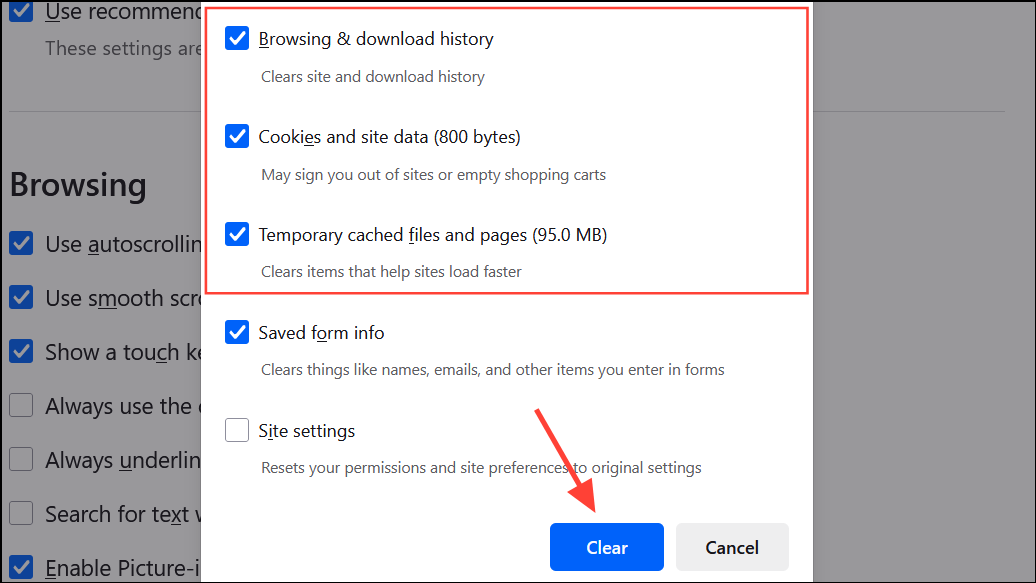 Step 3: Ensure Browsing & Download History, Cookies, and Cache are checked, then click Clear Now.