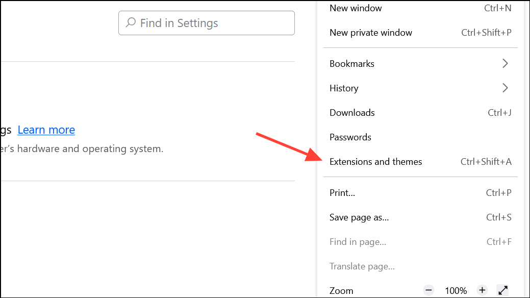 Step 1: Open the menu and select Extensions and themes.