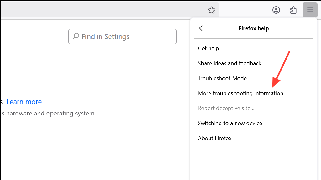 Step 1: Open the menu, select Help, then More troubleshooting information.