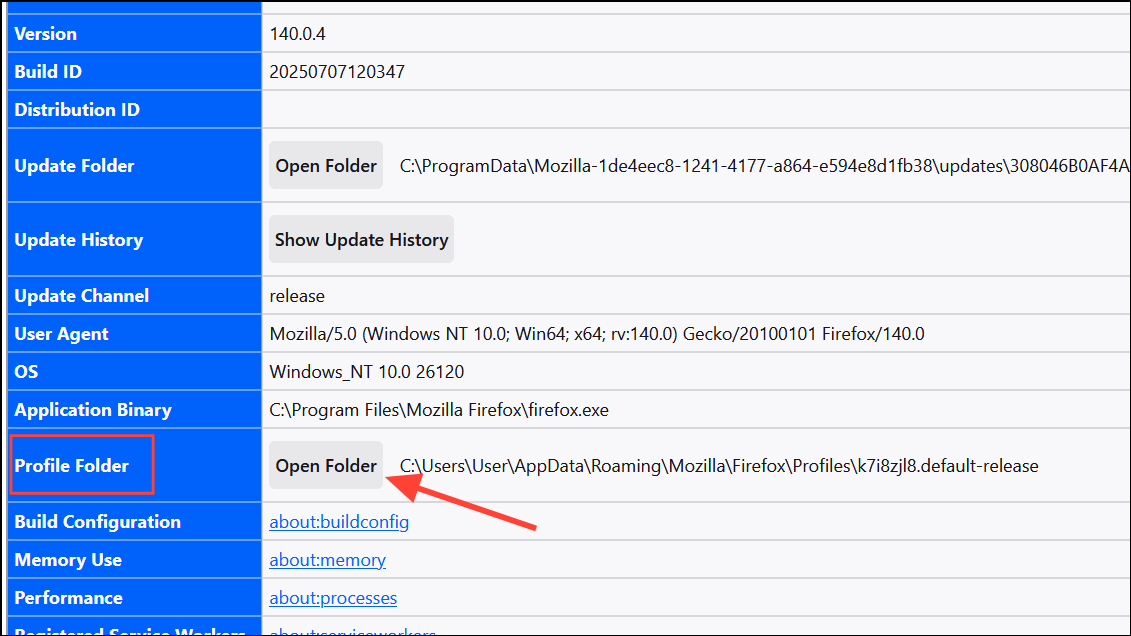 Step 2: Next to Profile Folder, click Open Folder. Close Firefox completely once the folder opens.