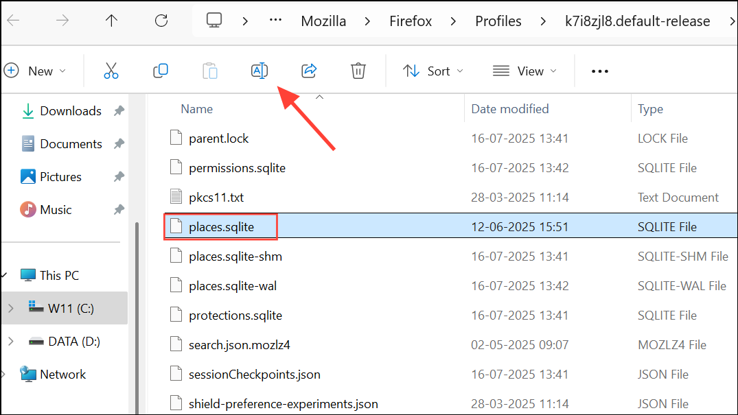 Step 3: Locate files named places.sqlite and places.sqlite-journal (if present). Rename them by adding .old to the end of each filename.