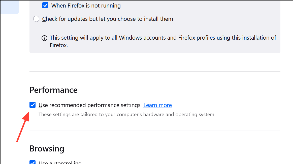 Hardware acceleration allows Firefox to offload graphical and video processing tasks to your system’s GPU, reducing CPU and memory load. If disabled, complex websites can cause high memory usage as Firefox relies solely on your CPU.