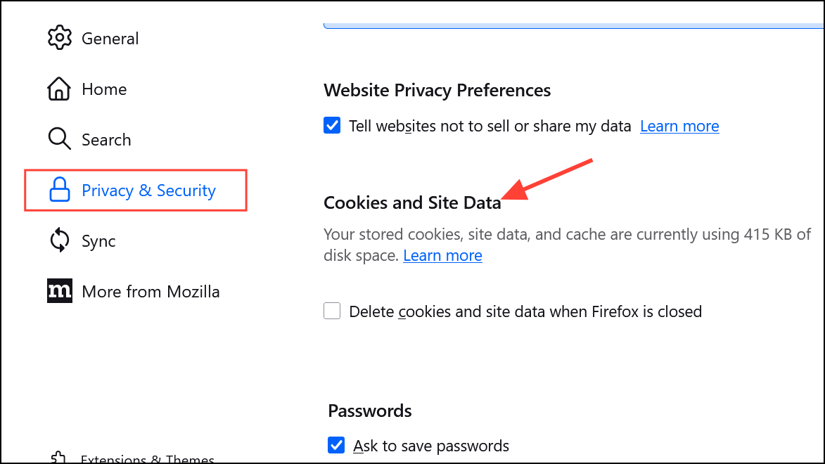 Step 1: Open Settings > Privacy & Security and scroll to the Cookies and Site Data section.